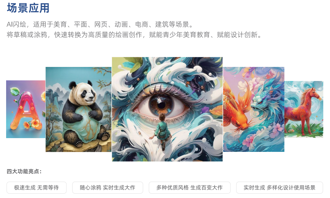 市面上现有的AIGC图像生成产品,大多只支持以文生图或以图生图。AI闪绘的出现填补了AI绘画实时生成这一细分领域的空白,在儿童美育、艺术设计、商业化设计、摄影等领域都有广泛的应用空间。