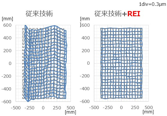 新产品除了采用和支持第6代玻璃基板的“MPAsp-E813H”(2014年9月发售)一样的每块面板多点同时测量的对位方式,此方式既保证了生产效率也实现了高精度曝光。同时,新产品还搭载了新开发的非线性补正REI(Real-Time Equalizing distorted Image)模块。搭载REI 模块后,即使曝光幅度扩大也实现了±0.30μm高套刻精度。