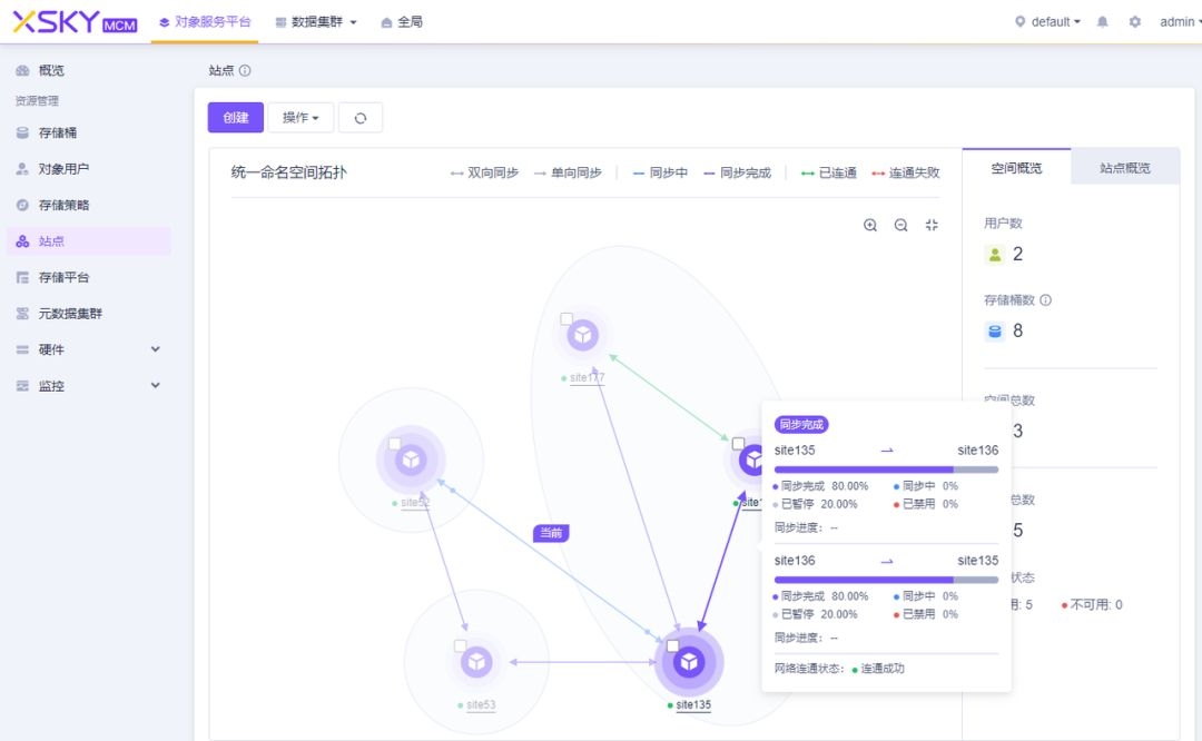 l 完善可视化:管理员可以查看全局所有站点的连通状态、同步状态、用户数量、存储桶数量等信息,增强了系统管理的透明度和控制力;