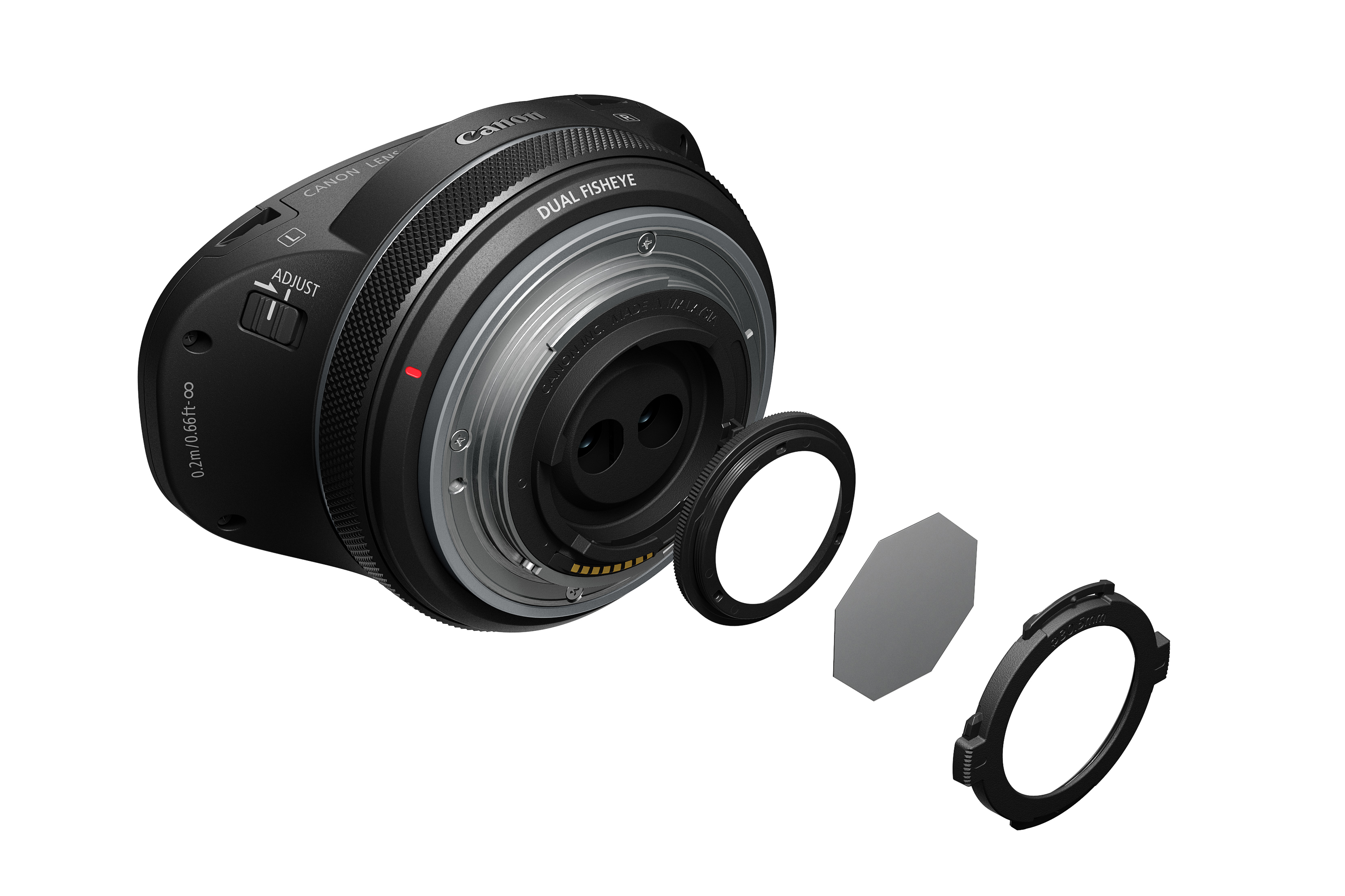 RF-S3.9mm F3.5 STM DUAL FISHEYE设计有对焦/控制环,通过对焦/控制环和对焦差调整模式开关可以调整左右对焦差。RF-S3.9mm F3.5 STM DUAL FISHEYE搭载驱动马达可以只单独驱动右侧镜头,这样一来便可使用左右对焦差调整模式开关和对焦/控制环来调节左右镜头的对焦偏差。