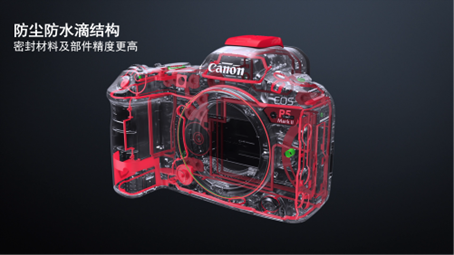 EOS R5 Mark II主要结构采用了耐撞击、高可靠性和散热性能好的镁合金材质,兼具轻量化与坚固性,此外,相机从外壳的接缝处到按钮、转盘类的边缝,均进行了防尘防水滴结构处理,有效减少水滴或灰尘侵入相机内部。