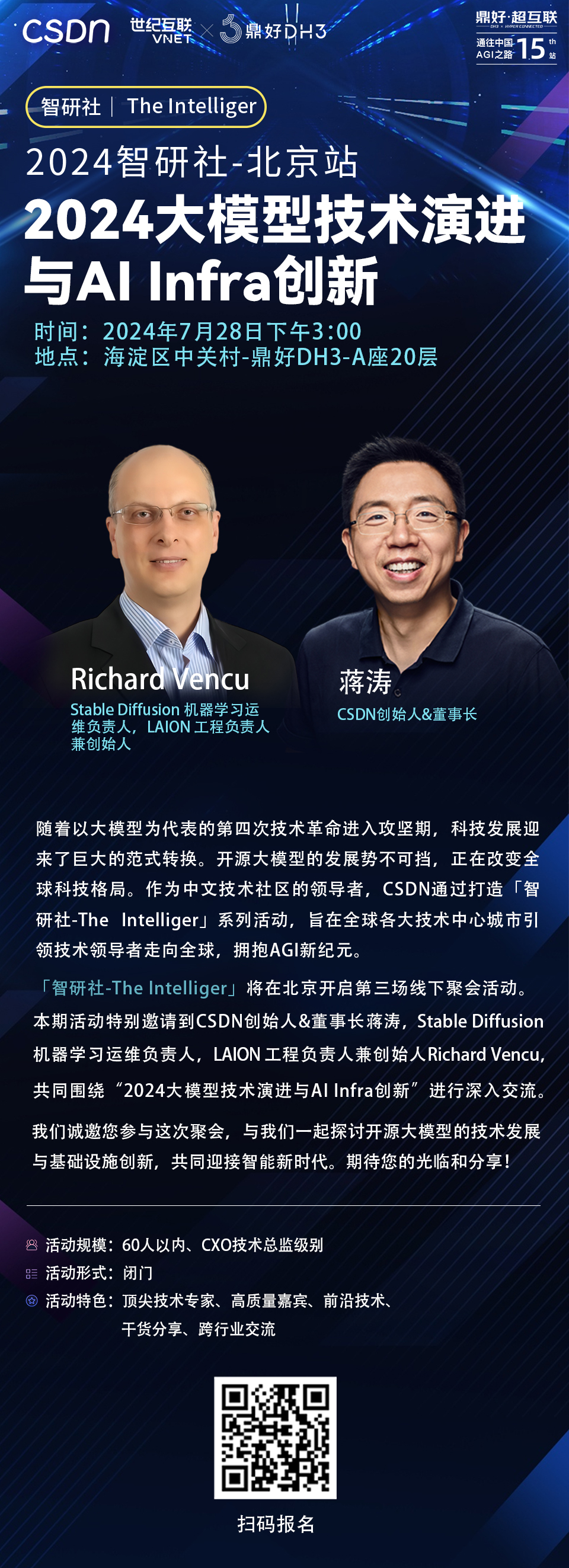 CSDN作为中文技术社区的领导者,通过打造「智研社-The Intelliger」在全球各大技术中心城市的系列活动,汇聚技术领导者与行业精英,洞察技术趋势,推动技术革新和战略思维的交融。引领技术领导者走向全球,拥抱AGI新纪元。「智研社-The Intelliger」将于7月28日在北京开启第三场线下聚会活动。本期活动邀请到的对话嘉宾是CSDN创始人&董事长蒋涛,Stable Diffusion机器学习运维负责人、LAION 工程负责人兼创始人Richard Vencu ,共同围绕“2024大模型技术演进与AI Infra创新”进行深入交流,与我们一起探讨大模型技术发展与基础设施创新。