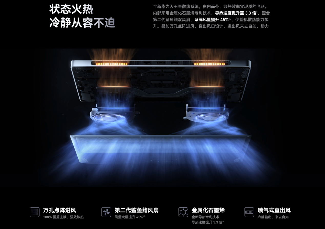 极致的性能释放也离不开稳定高能的散热设计,而MateBook GT 14带来了华为迄今为止最强劲、冷静的散热系统——华为天王星散热系统。