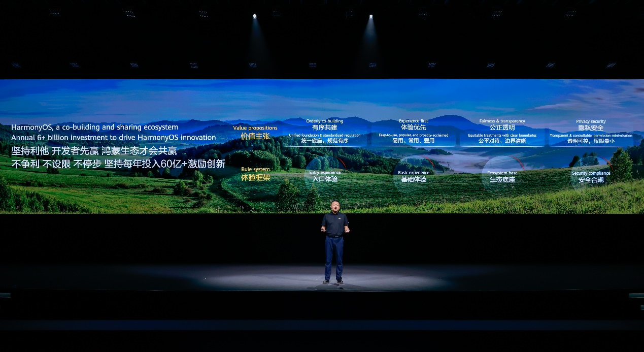 在生态理念方面,鸿蒙生态坚持利他,坚持与伙伴、开发者和谐共生,主张“有序共建”、“体验优先”、“公正透明”、“隐私安全第一”。鸿蒙不争利、不设限、不停步,坚持每年投入超过60亿元人民币用于支持和激励鸿蒙开发者创新。开发者先赢,鸿蒙生态才会共赢。