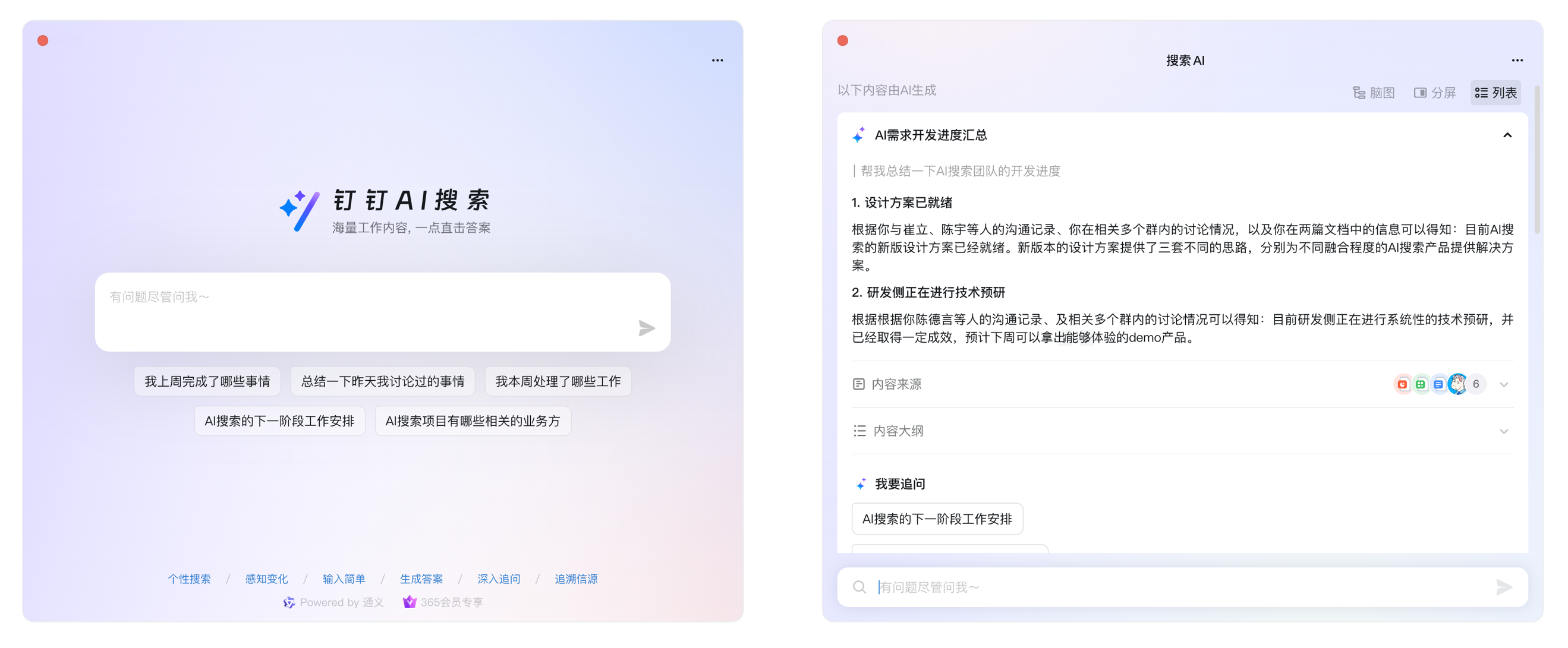 ● 钉钉AI搜索,可全面整合钉钉内聊天、文档、日志等离散的碎片化信息,整理为结构化的信息;