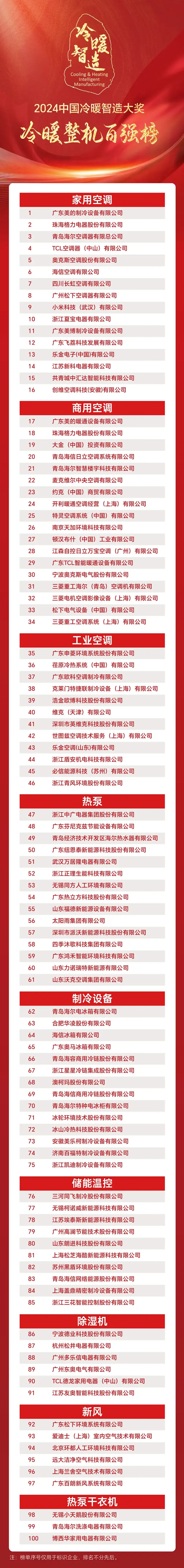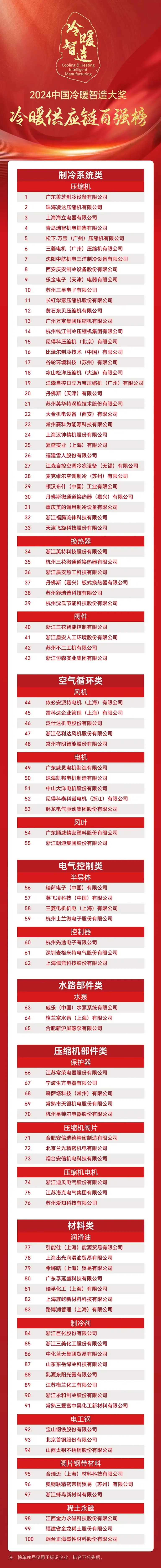 和勇于进取、探索创新的品格风貌,并引领产业绿色制造趋势。2024年,产业在线独家重磅推出“冷暖百强榜”,共评选出暖通制冷空调产业整机前100强及供应链前100强实力企业。