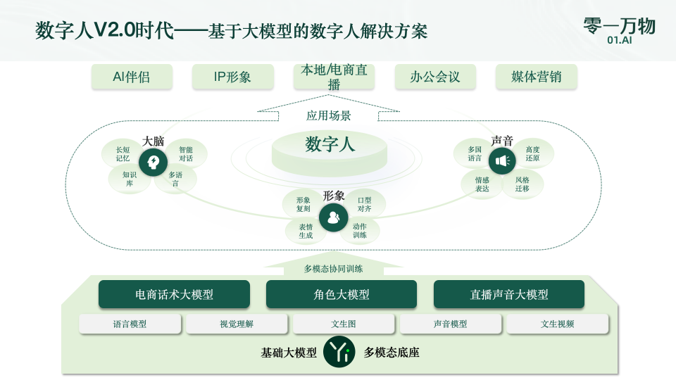 得益于零一万物在文本理解、多模态方面的模型能力,搭载角色大模型与直播声音大模型的零一万物 AI 2.0 数字人在形象更为逼真、声音也更贴合垂直场景的需求。
