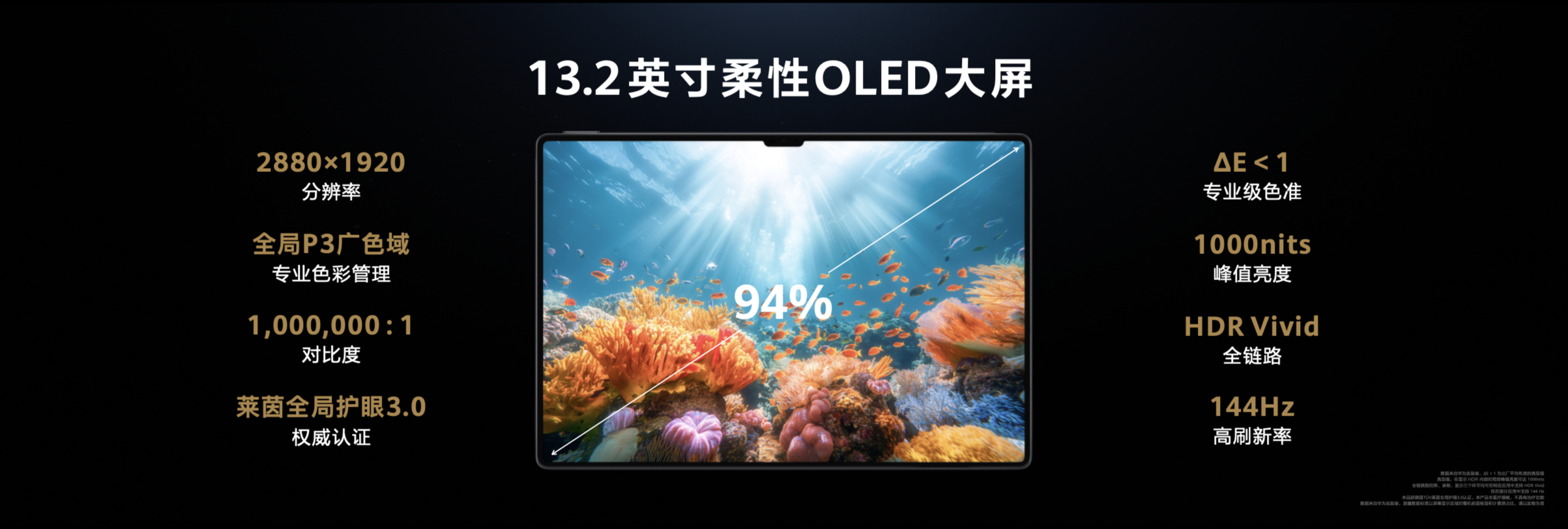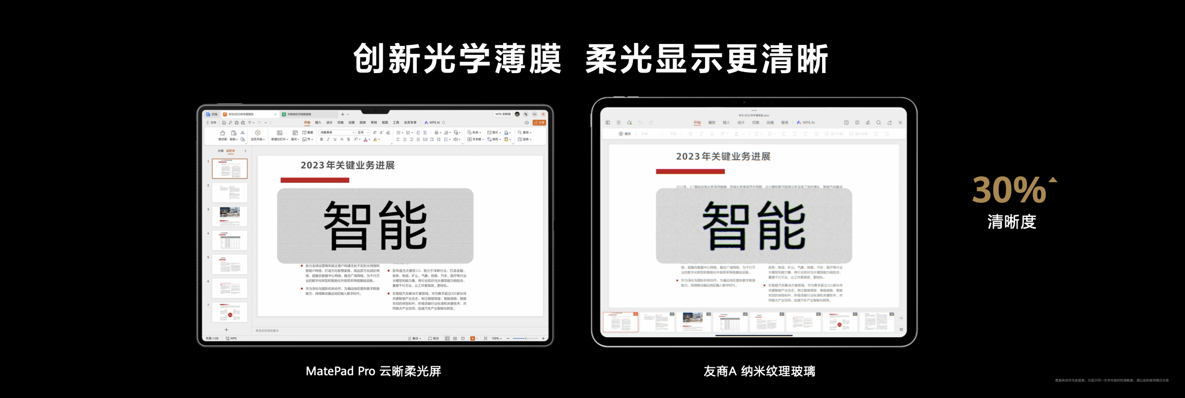 全新HUAWEI MatePad Pro 13.2 英寸搭载柔性OLED大屏,拥有 2.8K超高分辨率,1,000,000:1的高对比度与1000nits的峰值亮度,全天候都能保持清晰显示。结合华为云晰柔光屏技术,新品能够消除表面99%的环境干扰光,大幅减少入射光的反射,并通过新型光学膜材,让屏幕发光更均匀柔和,显示更清晰,给用户带来抗眩光、防反射、舒适护眼和清晰透亮的视觉体验。