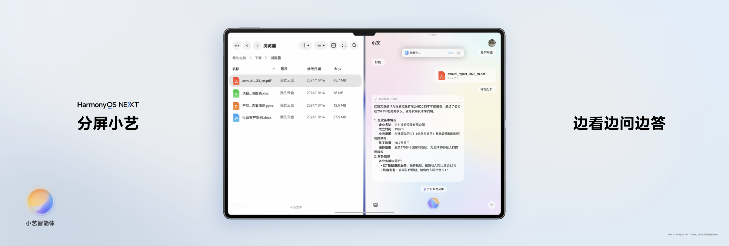 在HarmonyOS NEXT的加持下,小艺智能体也迎来全新升级。用户只需要将文本、图片、文档长按选中,并拖拽到屏幕下方弹出的对话框中,即可召唤小艺,让小艺进行表格提取、总结摘要、文档翻译等操作。“小艺分屏”模式下,用户还可以在生成内容的同时,打开华为笔记或备忘录进行记录,并针对感兴趣的问题进行提问,实现同步解答。不仅如此,全新小艺新增“识屏对话”功能,通过屏幕内容,小艺能理解用户口中的“这里”、“这个”等代词,带来了更加丝滑的问答体验。