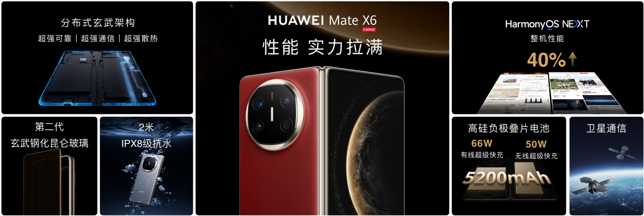 HUAWEI Mate X6首创分布式玄武架构,打破折叠屏主框和副框的传统布局,让手机副框空间利用率提升32%,天线、散热等元器件有了更充裕的排布空间,并通过创新材料应用,实现可靠性、通信及散热等方面的大幅提升,带来极致的空间利用和性能跃升。可靠性上,HUAWEI Mate X6搭载全新玄武水滴铰链、第二代玄武钢化昆仑玻璃等创新黑科技,与全新架构共同构筑起机身的钢筋铁骨,带来更为可靠耐用的用机体验。