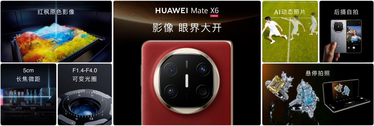 影像上,HUAWEI Mate X6在色彩还原方面实现了新的突破。HUAWEI Mate X6拥有华为影像XMAGE的强大能力,全新的红枫原色影像系统实现影像能力的再次提升,突破性地采用150万多光谱通道摄像头,色彩还原度提升120%,无论肤色、衣色还是自然色彩,都能准确捕捉、还原真实。HUAWEI Mate X6还搭载支持十档物理可变光圈的5000万像素超光变主摄、支持4倍光学变焦和5cm超级微距的4800万像素潜望式长焦微距摄像头、以及4000万像素超广角摄像头,并新增“扩展清晰”功能,微距拍摄前景后景皆清晰。