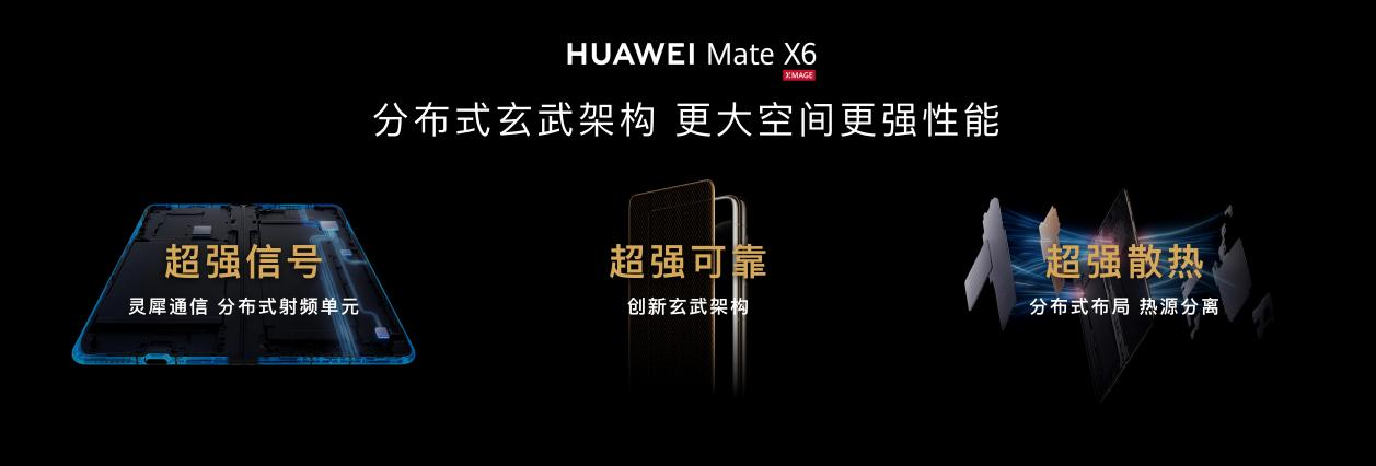 HUAWEI Mate X6首创分布式玄武架构,通过对折叠机主框和副框的零部件全新布局设计,并采用顶尖的创新材料,手机副框空间利用率提升32%,带来通信、散热、可靠性的全方位跃迁。