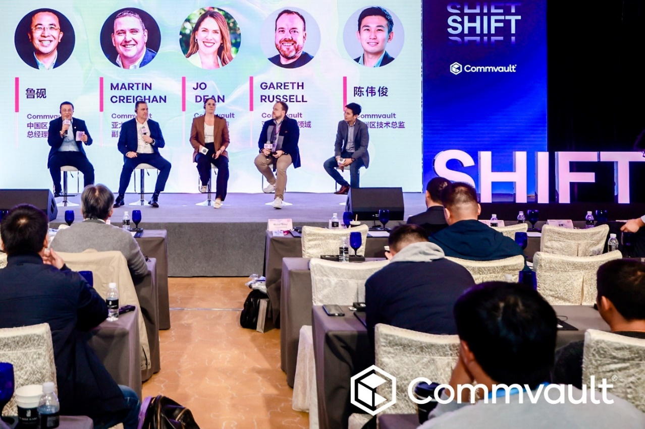 Commvault亚太地区副总裁Martin Creighan、Commvault亚太区渠道和联盟区域副总裁Joanne Dean、Commvault亚太区安全领域首席技术官Gareth Russell、Commvault亚洲区技术总监陈伟俊、Commvault中国区总经理鲁砚在大会的“对话时间”讨论环节,从各自的业务领域出发,分享了如何帮助中国企业构建数据保护架构,实现业务目标。