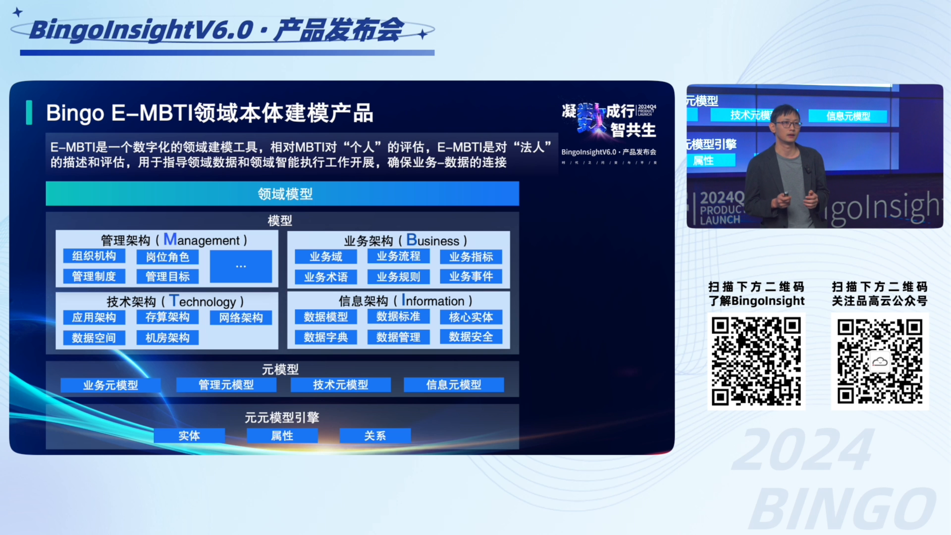 品高在理论层面综合并简化了Dodaf、Togaf等企业架构方法,同时融入了DCMM/DAMA等数据管理方法。在此基础上,总结提炼品高数百个项目咨询经验,最终创新性地提出了面向行业的领域本体建模方法——Bingo E-MBTI,通过M(管理架构)、B(业务架构)、T(技术架构)、I(信息架构)四个维度对“法人”进行描述和评估,构建法人单位在数字世界的结构化模型。