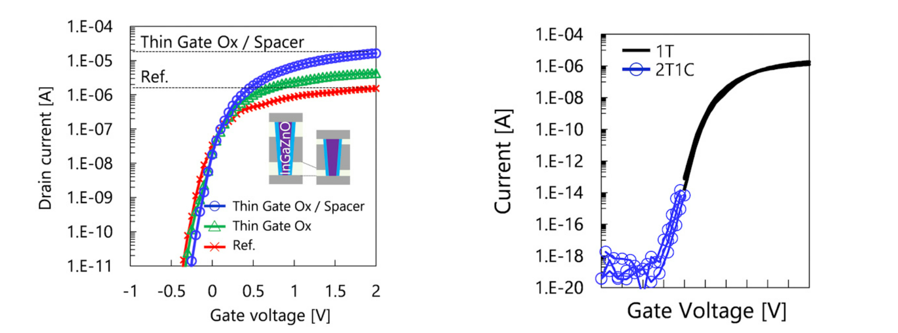 InGaZnO晶体管的(a)导通和(b)漏电流特性