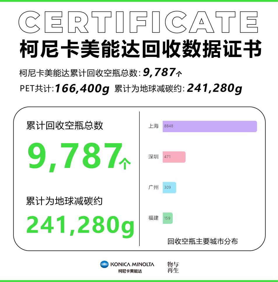 在本次“空瓶回收计划”实施期间,“物与再生”还定期提供了详尽的回收数据报告,包括空瓶回收量及因此而减少的碳排放量,确保每一份“捡塑”努力都能被清晰量化。截至目前12月底,柯尼卡美能达回收空瓶总数为9,787个,累计为地球减碳约241,280g。