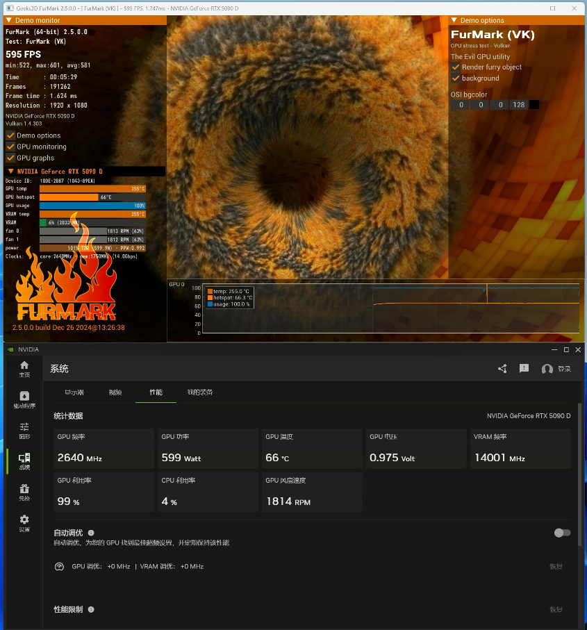 在ROG ASTRAL RTX 5090 D夜神显卡满载考机测试中,可以看到这时候整板功率达到了600W上限,GPU功率则保持在230W水平,考机温度仅有66℃左右。得益于3.8槽的四风扇散热器,噪声也控制得很好,达到了旗舰风冷显卡中的顶级水平,即便发烧级玩家长时间高强度玩游戏或AI创作,完全不用担心过热的问题,散热无忧!
