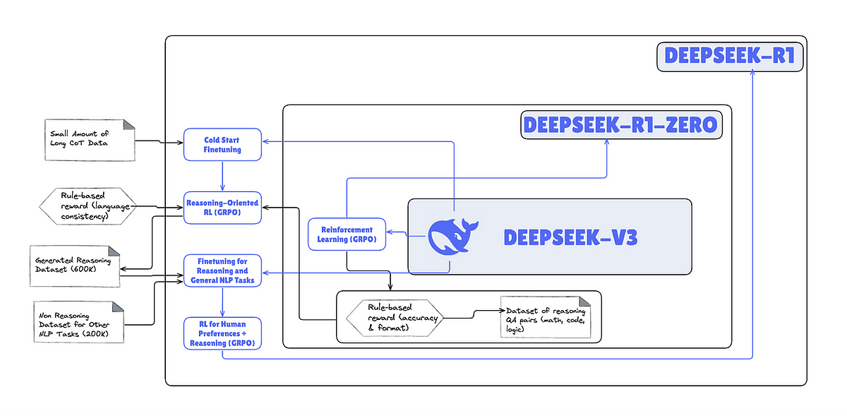 传统大模型通常依赖端到端的大规模自监督预训练(SSPT),而强推理 AI 模型(如 DeepSeek-R1)则在训练流程中融入了全新策略。具体而言,DeepSeek-R1 利用大规模强化学习参与训练,使模型在多步推理过程中自动生成中间逻辑,并通过多阶段训练及预热数据的辅助,显著提高了结果的可读性与稳定性。这一改变意味着 AI 开发不再仅仅追求“让模型记住答案”,而是教会模型“如何思考”。