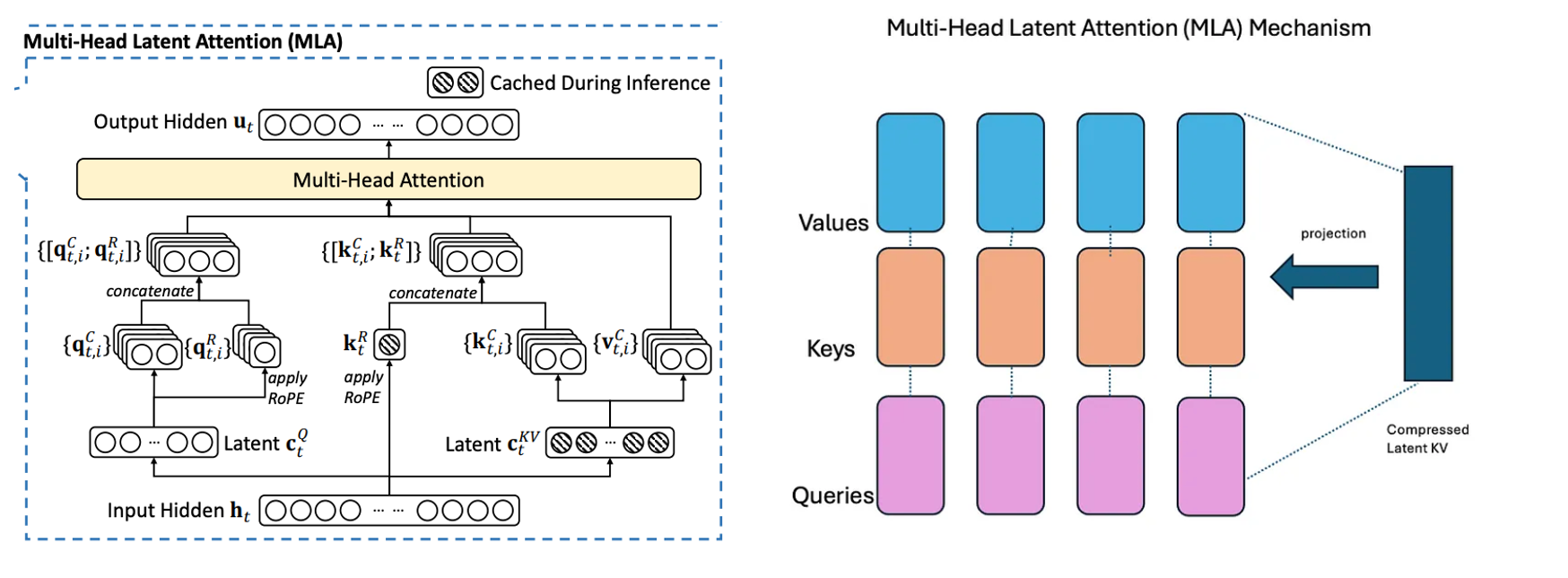 在推理阶段,强推理 AI 模型常常需要处理更复杂的数据交互与多步中间计算。以 DeepSeek 的 MLA(Multi-Level Aggregator)架构为例,其内置的多层 KV Cache 机制允许模型针对不同粒度和阶段的历史信息进行存储与调用,从而实现更灵活的链式推理(CoT)。这一机制显著区别于传统模型一次性输入所有上下文、直接输出答案的方式: