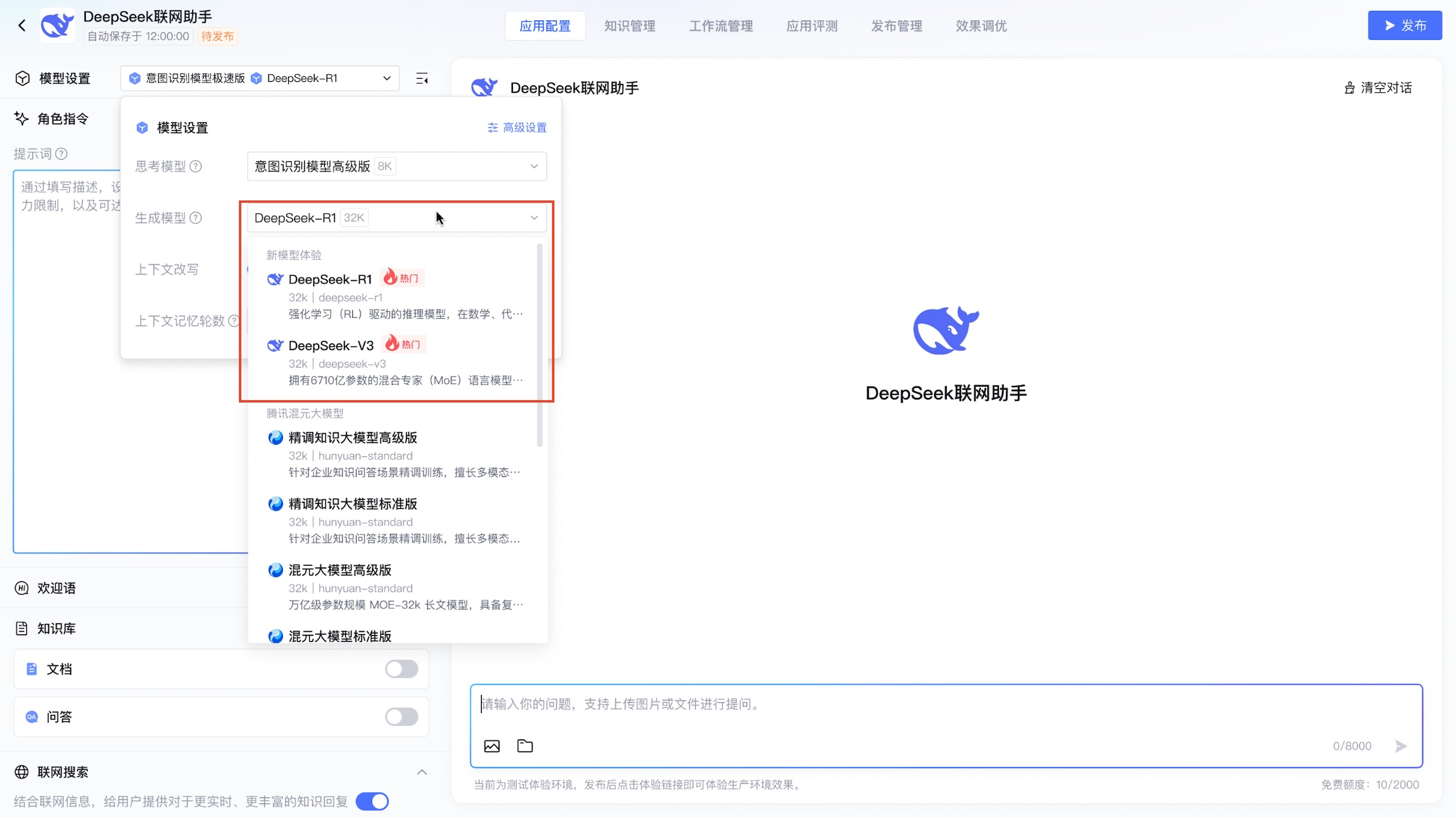 在应用搭建模式下,大模型知识引擎内置DeepSeek-R1和V3,用户可以根据自身需求选择大模型,结合平台的能力,通过拖拉拽的方式即可实现分钟级快捷搭建应用,开发过程稳定高效。