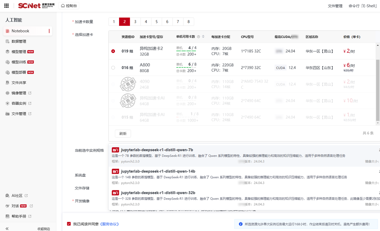 作为国家级综合算力服务平台,目前超算互联网已连接国内14个省的20多家超算和智算中心。目前平台上已有各类算力商品超6500款,其中AI模型服务近240款,既有DeepSeek、Qwen等国内开源模型,也有Llama、Stable Diffusion、Gemma等国外AI开源模型。
