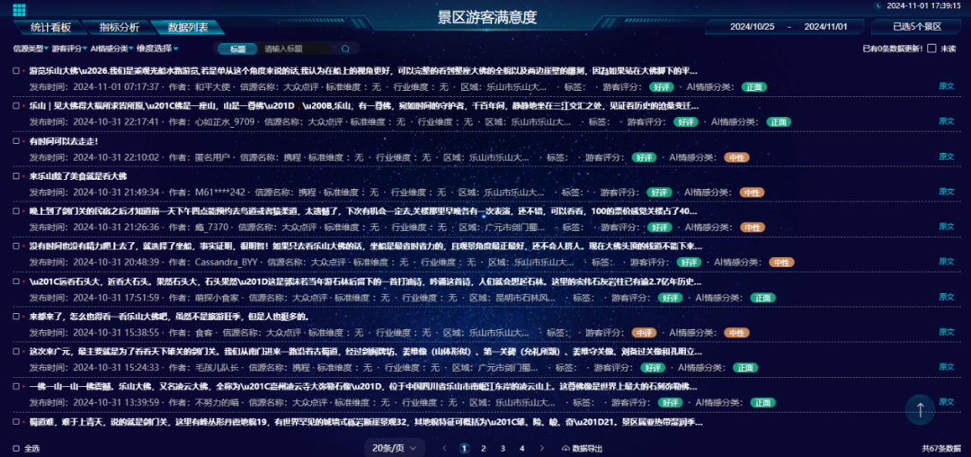 在数据查询方面,海鳗云景区游客满意度平台同样表现出色。数据列表页支持多条件查询,包括信源名称、游客评分、评价维度、情感类型等。这一功能让管理者能够灵活筛选和分析数据,精准把握游客满意度的细微变化。运营者可以根据不同的需求,快速定位到特定的评价信息,深入了解游客的需求和意见,为景区的精细化运营提供有力支撑。