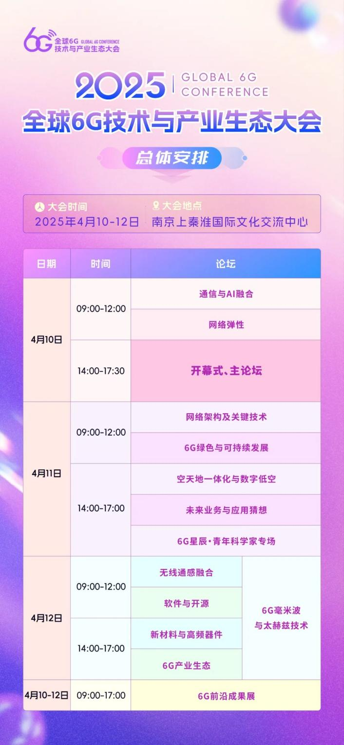 2025年4月10日至12日,由未来移动通信论坛、紫金山实验室主办的2025全球6G技术与产业生态大会(原全球6G技术大会)将在南京上秦淮国际文化交流中心隆重召开。本次大会以“共筑创新 同享未来”为主题,来自全球的6G领域的思想领袖、技术先锋和产业领军人物将再次齐聚金陵,共同探讨6G技术创新与未来产业生态的发展蓝图。目前大会官网www.g6gconference.com参会注册已经开放。