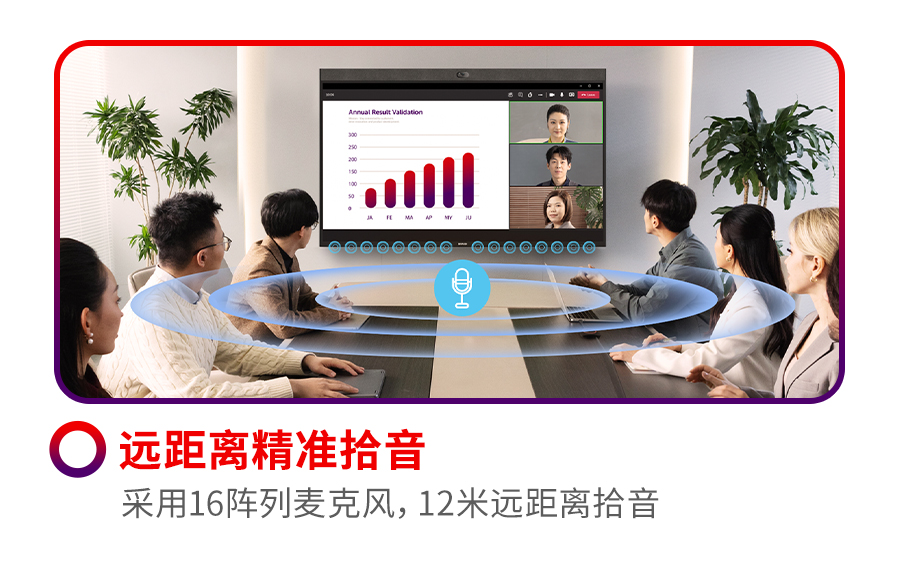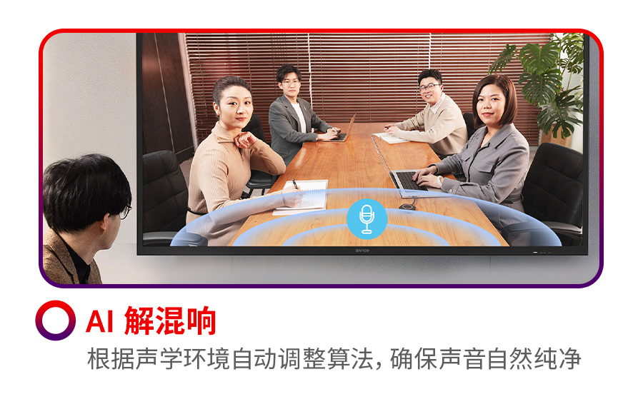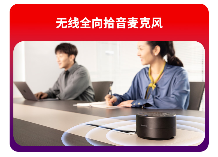 他介绍道,在视频会议中用户经常会遇到听不清、看不清的痛点。可立享无线会议屏正是针对这些痛点而专门设计的高度集成化产品方案。它集专业的音视频能力、显示效果与BYOM于一体。搭载16阵列波束成形麦克风,12米远距离拾音,具有单独的硬件加速能力,以AI深度神经网络算法加持,轻松应对远距离拾音、噪声、回声、混响等声学挑战。使远距离沟通如同面对面,即使在复杂的声学环境也能从容应对。