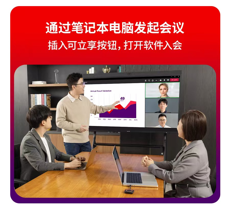 笔记本电脑插入可立享按钮,打开软件入会,简单2步就可以开启视频会议。兼容主流云视频会议平台,自动调用无线会议屏音视频,保障高品质会议效果。