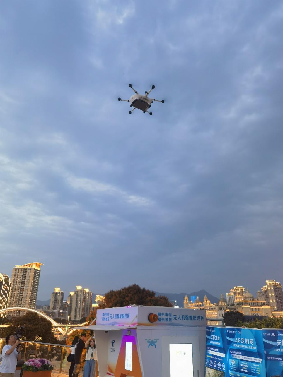 福州电信相关负责人介绍,目前已在台江路电信局建设毫米波感知基站,覆盖闽江之心到青年广场区域,基于一体部署架构,引入核心网通感功能,提供目标检测、轨迹识别能力演示。在物流配送领域,中国电信在福州闽江之心广场部署了无人机智能配送柜站,为园区提供空地一体的自动化货物接收、存储和转运服务,物品通过无人机运输从台江区电信局运送至闽江之心,仅需3分钟就能运抵,大大节省了时间成本。