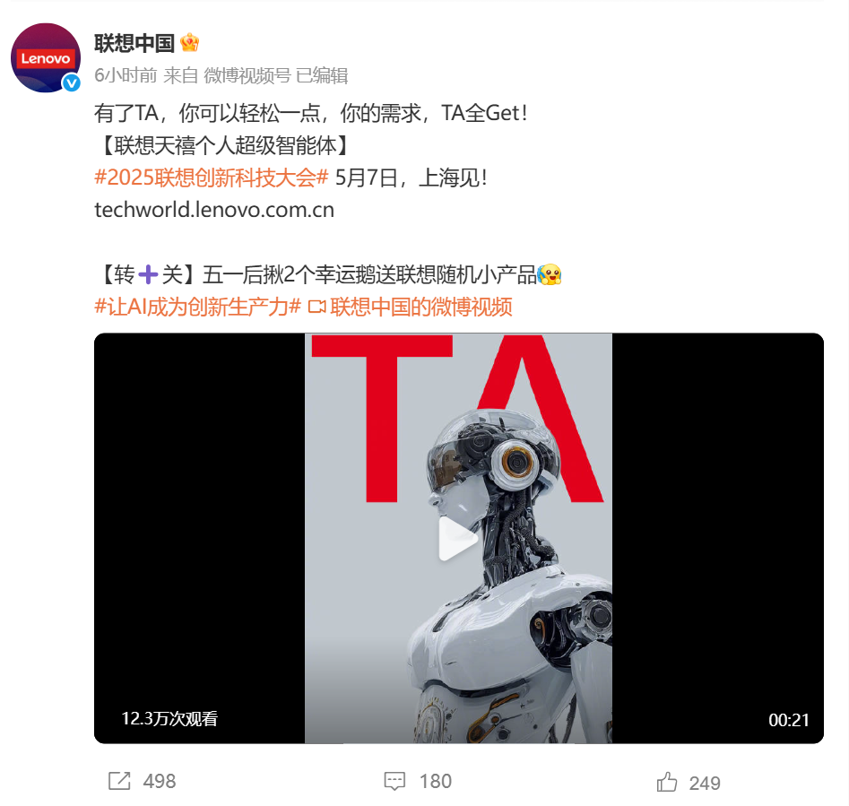 5月7日,联想创新科技大会(Tech World)将在上海盛大启幕。本次大会以“让AI成为创新生产力”为主题,聚焦人工智能技术的普惠化与场景化。作为重磅发布之一,联想近日释放出天禧个人超级智能体的首张海报和视频。