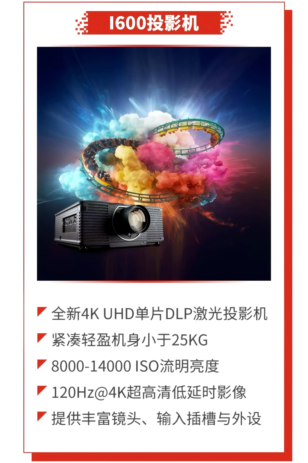 I600是全新4K UHD单片DLP激光投影机,具有更轻盈的体积、更明亮的图像质量、更优秀的可视化技术,具有8000-14000 ISO流明亮度,120Hz 4K超高清低延时,紧凑轻便,不到25kg,易于安装和运输,提供丰富镜头、输入插槽与外设,适配广泛行业。
