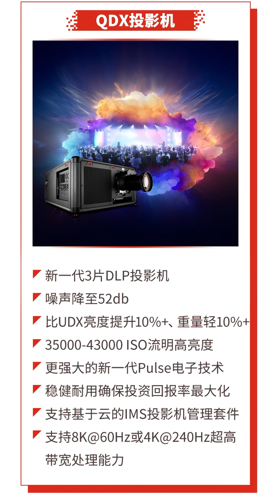 QDX系列是新一代三片DLP激光投影机,亮度提升10%,重量轻10%,亮度高达35000-43000 ISO流明,同时噪声降至52db,支持8K@60Hz或4K 240Hz超高带宽处理能力,更强大的新一代Pulse电子技术,满足客户对图像质量和色彩还原的更高需求。