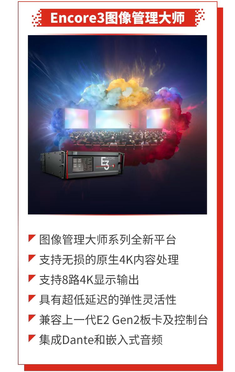 Encore3是图像管理大师系列全新平台,更为先进可靠,输出带宽比上一代产品E2提升一倍,支持8路4K显示输出,信号延迟更低,功能更强大且稳定。同时,Encore3兼容上一代E2 Gen2板卡及控制台,集成Dante和嵌入式音频,客户在升级换代时可节省投资成本