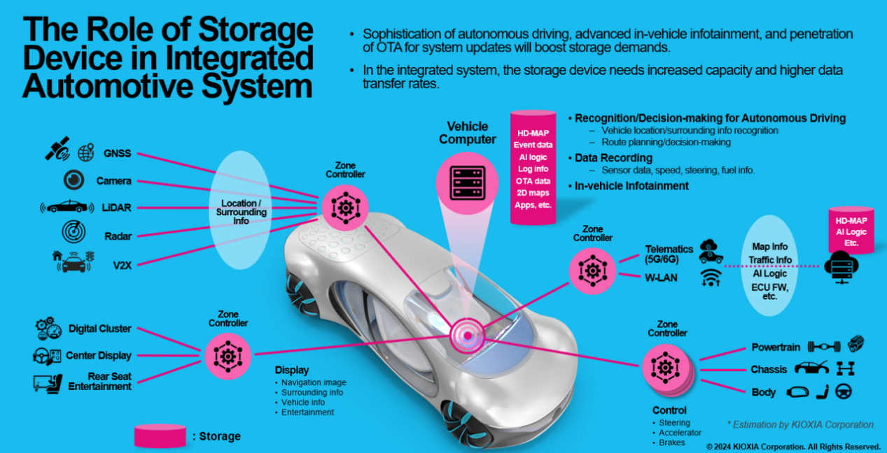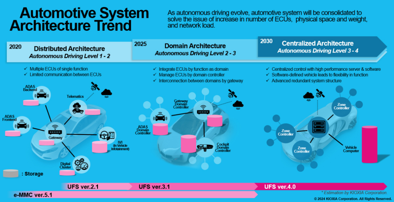 显然,传统的单一功能的集成式ECU已经无法满足响应需求,域类型架构和未来的中央集成式架构成为新的趋势。类似于个人电脑,车载ECU要在扮演中央处理的角色,要快速获取摄像头、激光雷达传感器、高精度数据地图、V2X数据,也要快速运行大模型、人工智能算法,大量的读取和写入,也注定了车载数据存储要可靠、大容量且高效率。