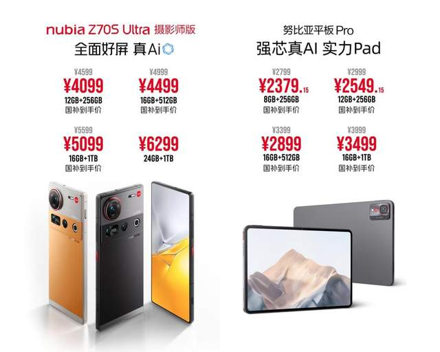 即日起,努比亚Z70S Ultra摄影师版在中兴商城及各大线上线下合作渠道正式开售,新机拥有暮影、熔金两款配色,国补到手价4099元起;专业摄影套装售价899元。努比亚平板 Pro即日开启预售,京东先人一步现货发售,5月6日全渠道正式开售,国补到手价2379.15元起。
