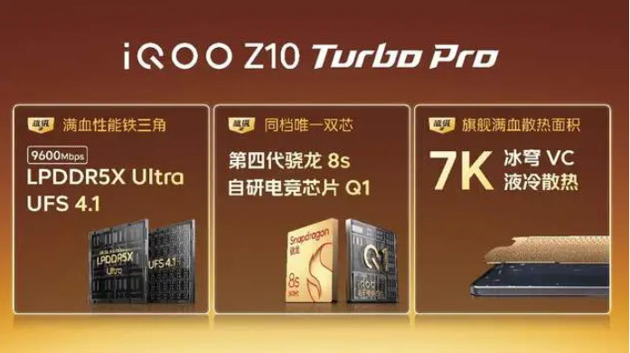 除搭载天玑 8400 满血版,iQOO Z10 Turbo 核心配置全面看齐Z10 Turbo Pro:机身厚度薄至 8.09mm,通过国家军标抗冲击测试,搭载自研电竞芯片Q1、旗舰 144Hz 光域护眼屏、24 根环绕式天线、7K 冰穹 VC 液冷散热系统、5000 万像素索尼大底光学防抖主摄以及 OriginOS 5等,还通过 KPL 比赛用机测试认证,实力亦达到 Pro 级。