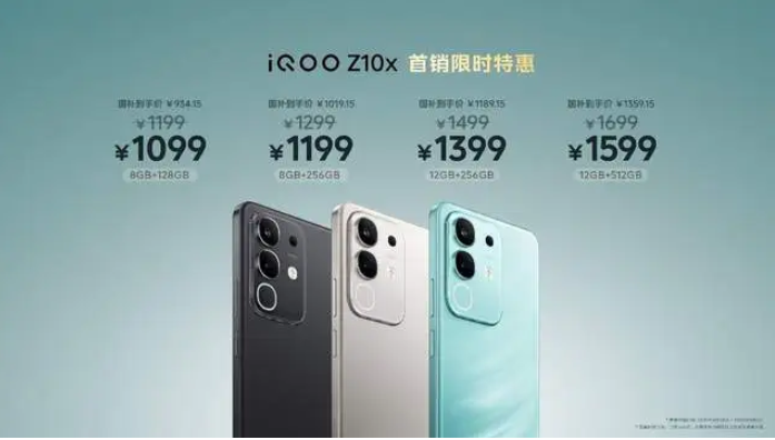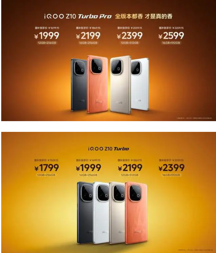 iQOO Z10 Turbo 系列共有“燃”、“沙漠色”、“云海白”和“星穹黑”四种配色可选,两款产品都提供 12GB+256GB、12GB+512GB、16GB+256GB 和16GB+512GB 四种存储组合可选,iQOO Z10 Turbo Pro 到手价 1999 元起,国补到手价 1699.15 元起、iQOO Z10 Turbo 到手价 1799 元起,国补到手价 1529.15 元起。iQOO Z10x 共有“风羽青”、“月岩钛”和“星穹黑”三种配色可选,提供 8GB+128GB、8GB+256GB、12GB+256GB 和 12GB+512GB 四种存储组合可选,到手价 1199 元起,首销限时特惠全版本减 100 元,到手价 1099 元起,国补到手价934.15 元起。