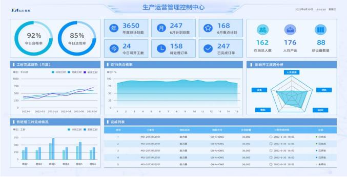 生产管控:KMMOM支持多种途径的订单接收和拆分、排程优化以及资源分配和任务下达,实现订单状态的实时动态追踪,以及多层级多维度的生产监控;