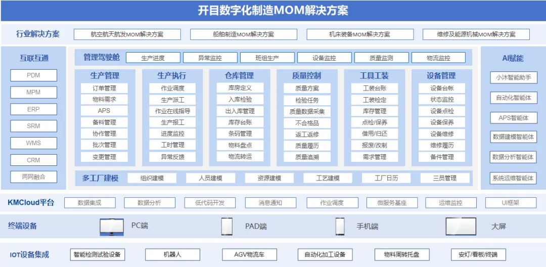 MOM系统的应用成效,很大程度上取决于供应商对行业制造流程的深度理解与精准把握。开目公司深耕高端制造领域30年,服务众多高端装备和军工制造龙头企业,沉淀出航空航天航发、船舶制造、机床装备、维修及能源机械等多套行业解决方案。通过将丰富的行业Know-How融入MOM产品之中,使KMMOM CLOUD V3.0能够精准契合工厂与车间管理的实际需求,真正实现“复杂需求产品化、个性场景配置化”。