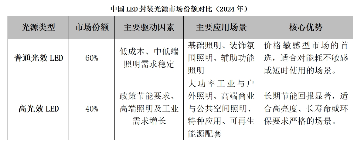从数据轨迹看,2022-2024年期间,LED封装光源市场规模年复合增长率约为5.7%。尽管增速相对温和,但行业呈现结构性优化特征,这也表明行业正从技术迭代初期向规模化应用阶段过渡。这一增长主要得益于两方面驱动:其一,上游材料供应链成熟和下游技术改进要求(如车载LED对高显色性的要求),推动封装光源向高光效封装光源方向升级;其二,全球范围内对能效标准的提升及碳中和目标,推动高光效LED代替传统照明。这些因素都进一步激活高光效封装光源的市场需求。