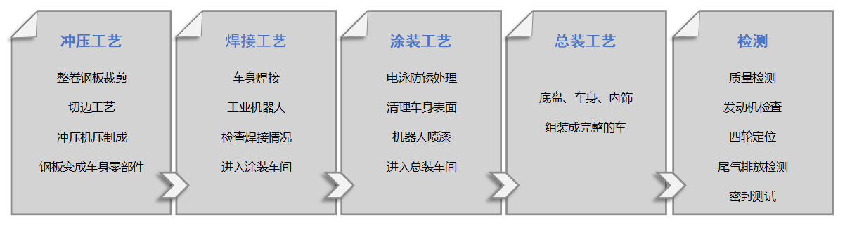 车企的核心产线通常围绕汽车制造的四大工艺展开,涵盖从原材料加工到整车装配的全流程,包括:冲压自动化生产线、车身焊接和装配自动化生产线(焊装)、喷涂自动化生产线(涂装)以及整车装配自动化生产线(总装)。