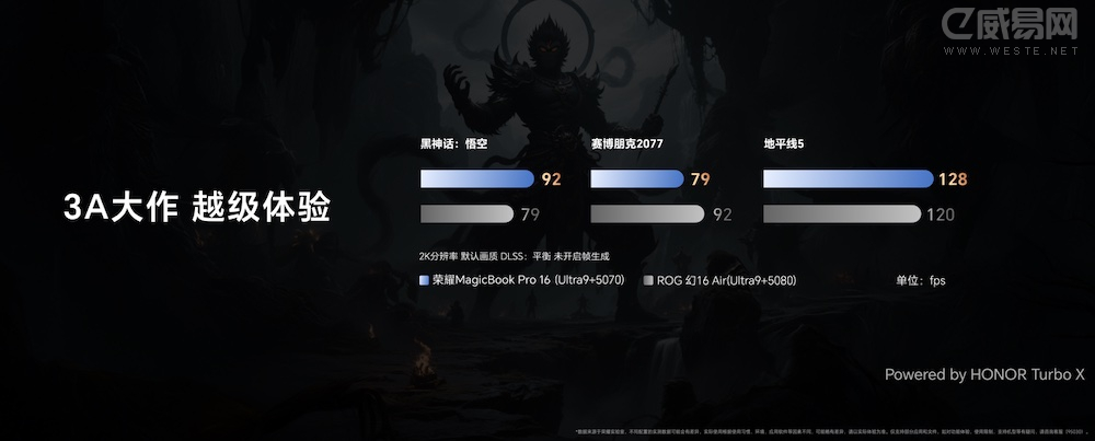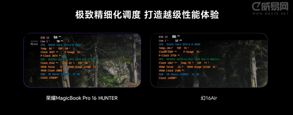 荣耀MagicBook Pro 16 HUNTER版2025拥有智能、高能、狂战三档性能模式可选,在狂战模式下,整机最高可释放150W超强性能。在HONOR Turbo X调校技术加持下,这款笔记本在不少主流3A和网游中实测的游戏帧率都达到行业领先水平,为用户带来更强大和流畅的越级体验。
