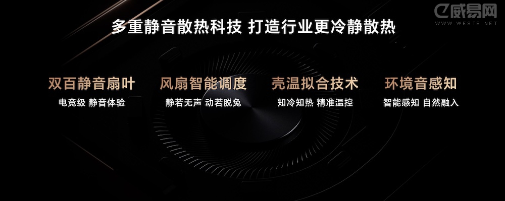 同时,产品采用全新荣耀智静散热设计,配备行业领先12mm大直径复合3D隧道式热管、12V电竞级双百叶静音风扇、相变导热材料、0.075mm超薄纯铜散热鳍片等散热组件,搭配风扇智能调度、壳温拟合以及环境音感知等技术,打造行业更冷更静的散热体验。