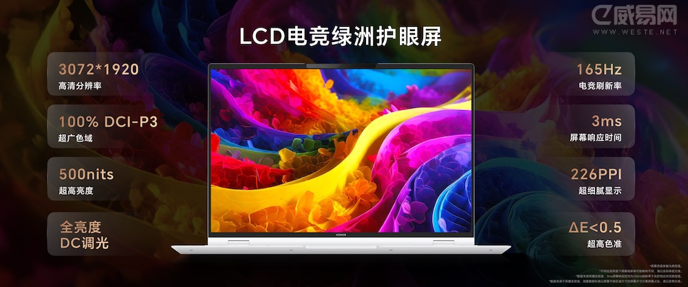 屏幕上,荣耀MagicBook Pro 16 2025全系搭载3072*1920高分辨率的LCD屏,16:10屏幕比例,屏占比达到93%,拥有100% DCI-P3广色域,10.7 亿色深。屏幕亮度最高500尼特,刷新率165Hz,屏幕响应时间仅为3ms。支持行业最多的13种色彩模式,几乎涵盖99%的生产力场景。