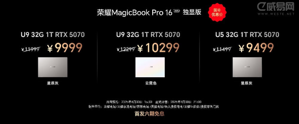荣耀MagicBook Pro 16 2025提供独显和集显两种配置,满足用户的不同预算需求。其中,搭载RTX 5070独立显卡的荣耀MagicBook Pro 16 HUNTER版2025国补到手价9499元起,4月30日21:00全渠道首销;集显版国补到手价5039.2元起,4月30日15:30全渠道首销,想抢先体验的用户可以抓紧时间入手。