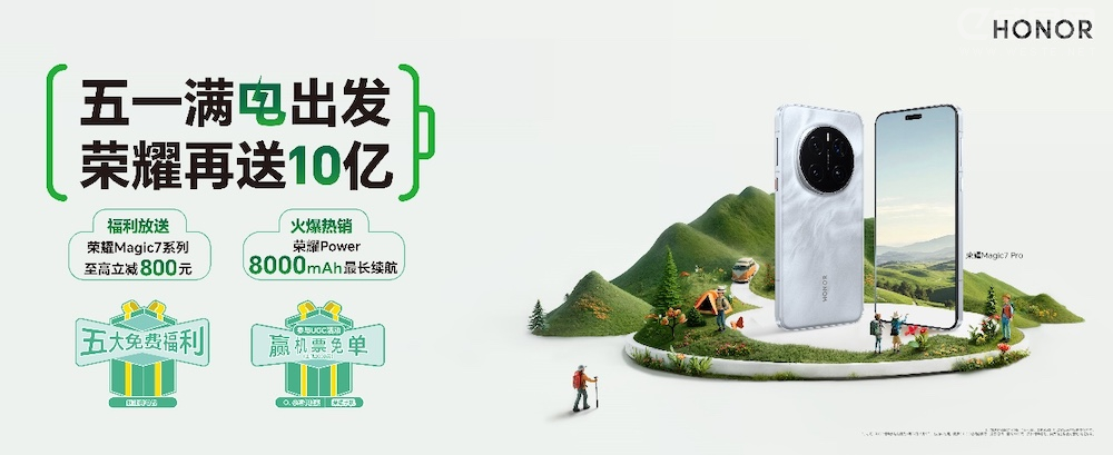 “五一满电出发,荣耀再送10亿”补贴活动也已开启,在“国补+厂补”双重补贴下,荣耀Magic7系列手机至高立减800元,售价下探至3799元起。