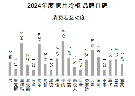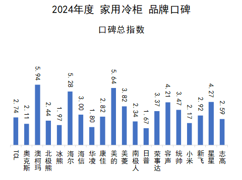 澳柯玛、美的、海尔占据口碑总指数前三,容声、星星、美菱等品牌连续两期稳居前十。本期新晋品牌包括冰熊、华凌等,而TCL掉出前十。荣事达表现亮眼,从第16名跃升至第8名,成为最大“黑马”;TCL则降幅显著,从第6名跌至第12名。