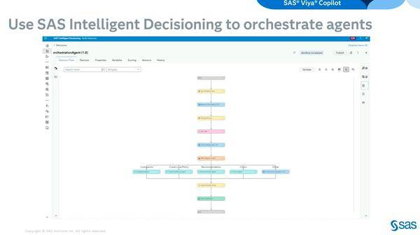 2019年,SAS Viya将SAS Decision Manager重新命名为SAS Viya Intelligent Decisioning;在SAS Innovate 2025上,SAS Viya Intelligent Decisioning新增了智能体设计功能,通过可视化的界面,开发者能够根据业务复杂度、风险和业务目标,用拖拉拽的方式将智能体嵌入到业务流程中,同时决定智能体的自治程度和人工介入程度。而智能体则以容器方式进行部署,能够灵活地以应用、聊天机器人以及其它业务流程方式部署。