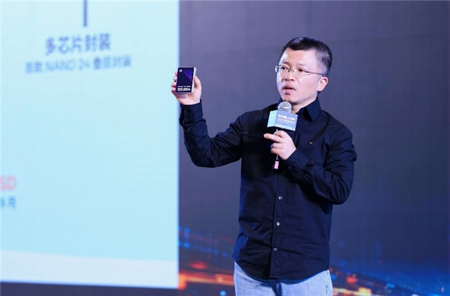 Solidigm亚太区销售副总裁倪锦峰向现场观众展示Solidigm 122TB D5-P5336 SSD
